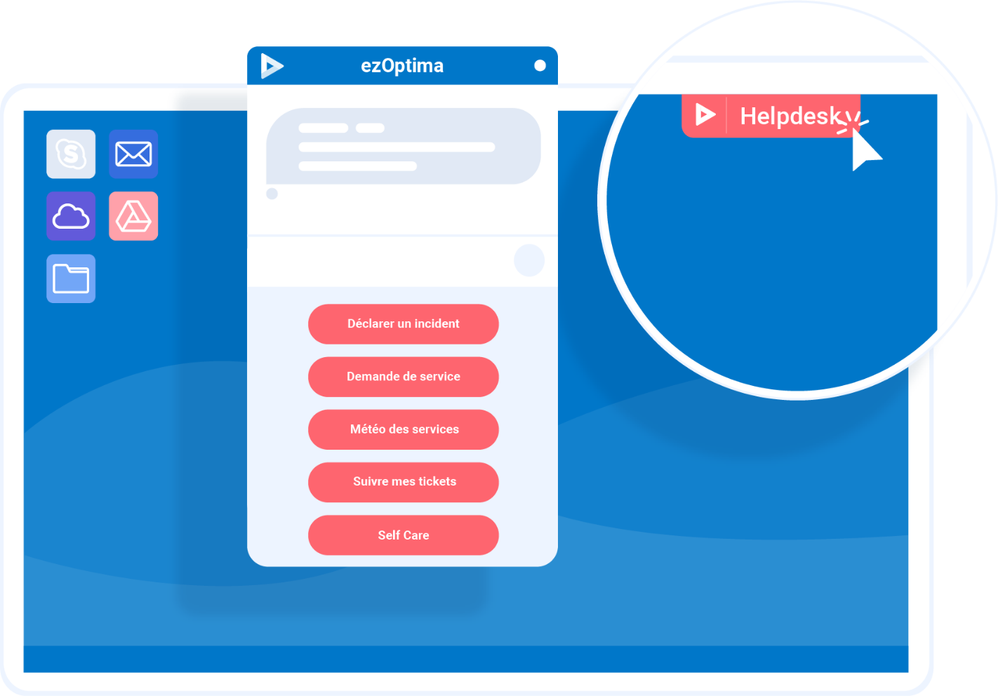 ezOptima est positionné sous forme de bouton sur le premier plan du bureau dans le coin supérieur. Ce bouton est à la fois très discret et facilement accessible. En, un clic, vos utilisateurs métier accèdent à l’ensemble des services offerts.