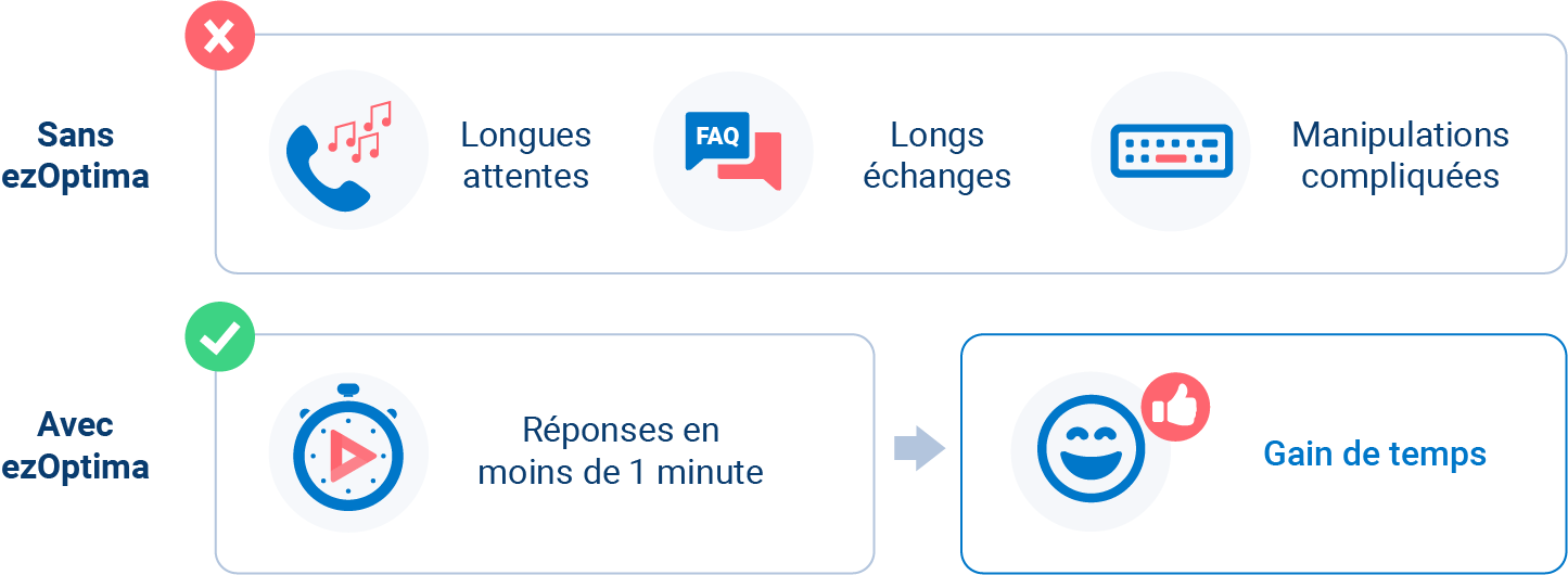 Fini les longues attentes au téléphone, les questions réponses et les manipulations techniques téléguidées. Avec ezOptima, vos utilisateurs métier obtiennent des réponses pertinentes à leurs demandes de manière simple et rapide tout en autonomie.